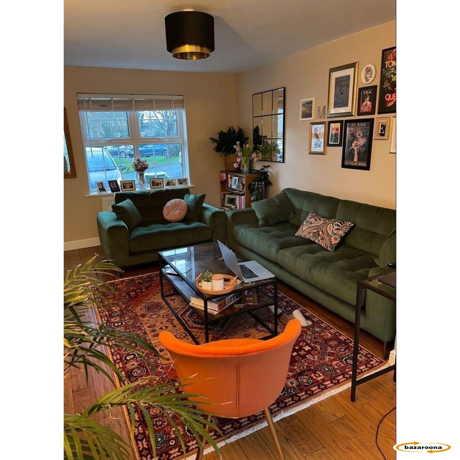 The product is a modern, comfortable sofa with a green color. It features a sleek design that adds elegance to any living room. The sofa is adorned with several cushions in different colors, enhancing its aesthetic appeal and providing additional comfort. It is perfect for relaxing, reading, or hosting guests.