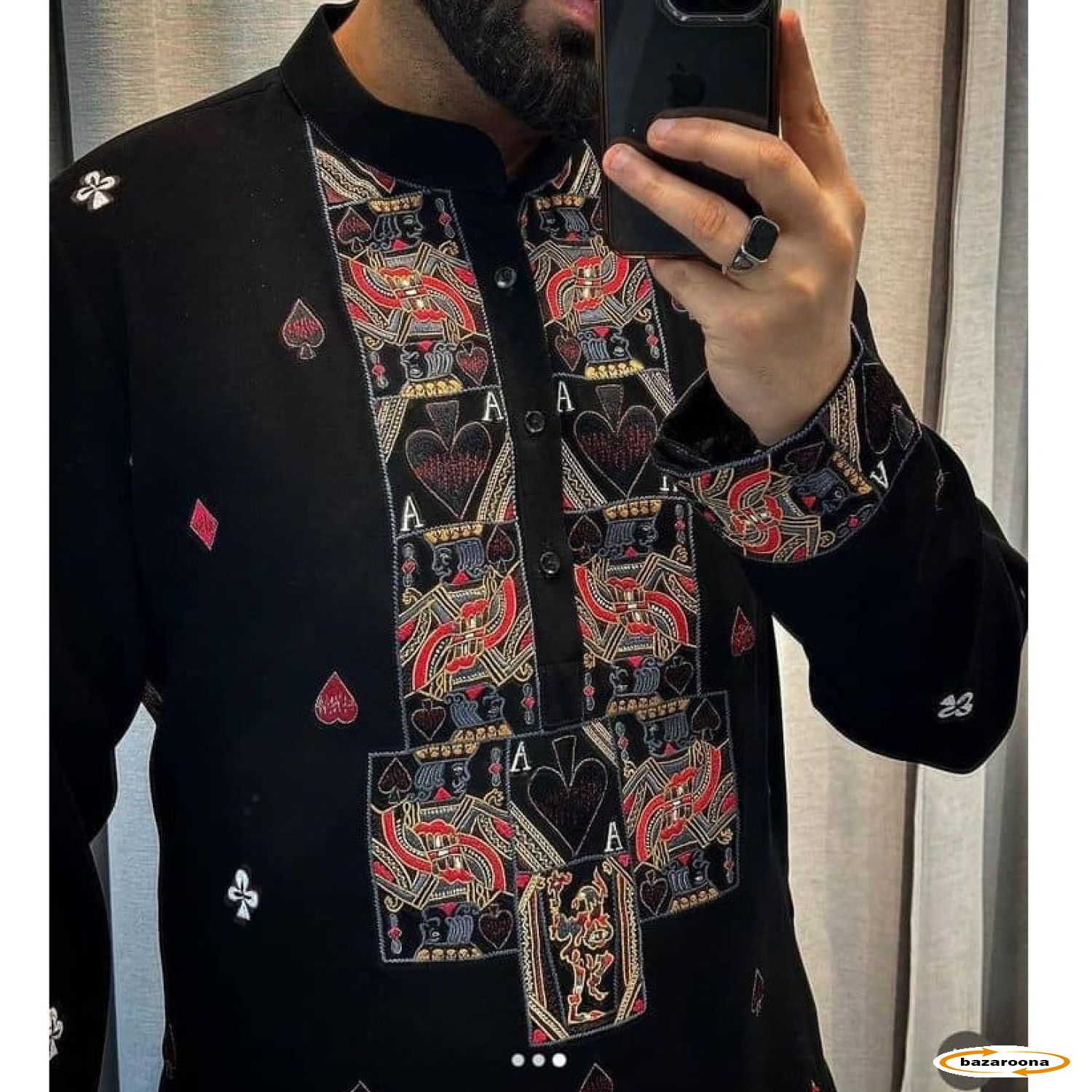 این پیراهن مردانه با گلدوزی رنگ های ترکیبی روی یخن، از ۱۰۰٪ نخ ساخته شده است. جنس این لباس با دوام و باکیفیت است که در برابر شتشو مقاومت دارد