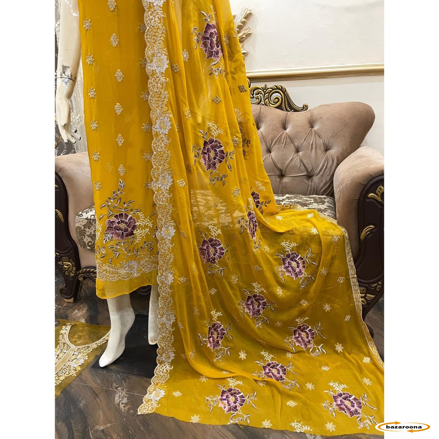 لباس حاشیه‌دوزی شده با گل‌های زیبای شیفون خالص همراه با چادر کاملاً گلدوزی شده زیبا با حاشیه و تکه اضافی انتخابی گلدوزی شده