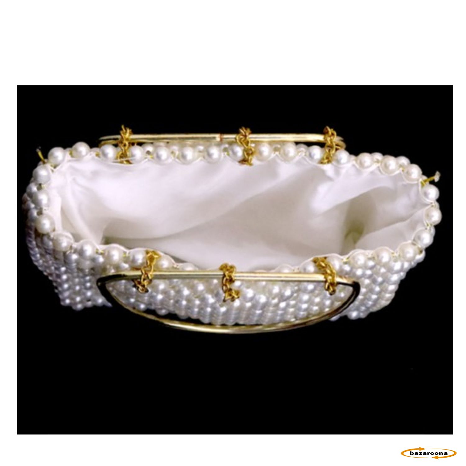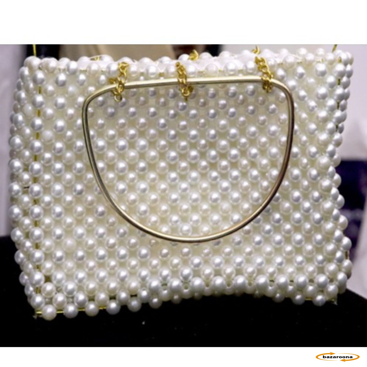 کیف دستی زنانه با دیزاین مهره دوزی رنگ سفید و زنجیرگ طلایی