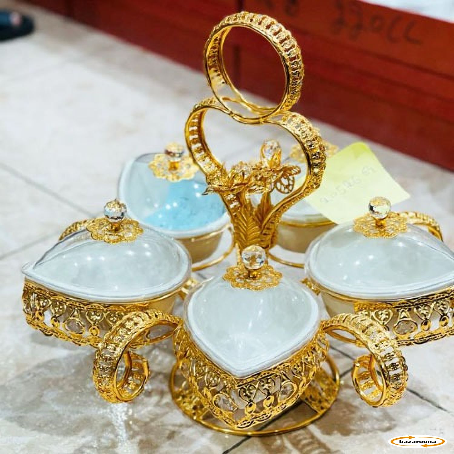 Beautiful home decor dried fruit plate. This is made of nickel and plastic covers that have beautiful and stylish designs to decorate your home with.