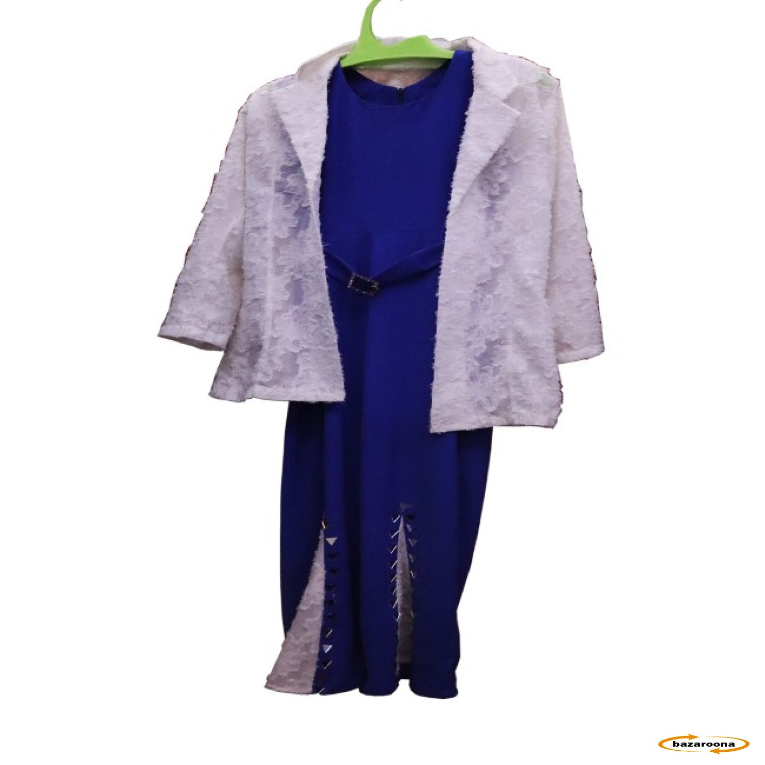 دا جامه یو اوږد شاهي نیلي لباس دی چې له سپینې لیس جاکټ سره یوځای شوی. لباس یو ساده مګر ښکلی ډیزاین لري، په کمر کې د بیلټ جزئیات او په پښه کې سینګار شوي عناصر لري. سپین لیس جاکټ دې لباس ته یو نرم او رسمي لمس ورکوي، دا جامه د وادونو، مېلمستیاوو، یا نورو ځانګړو مراسمو لپاره مناسبه ده.