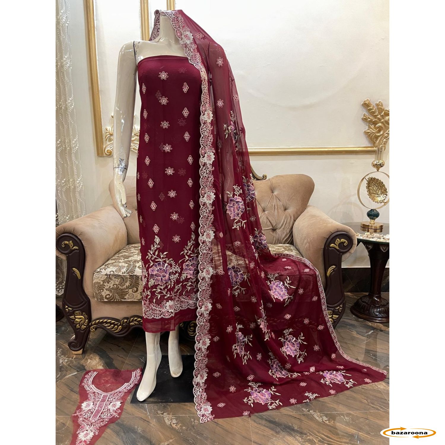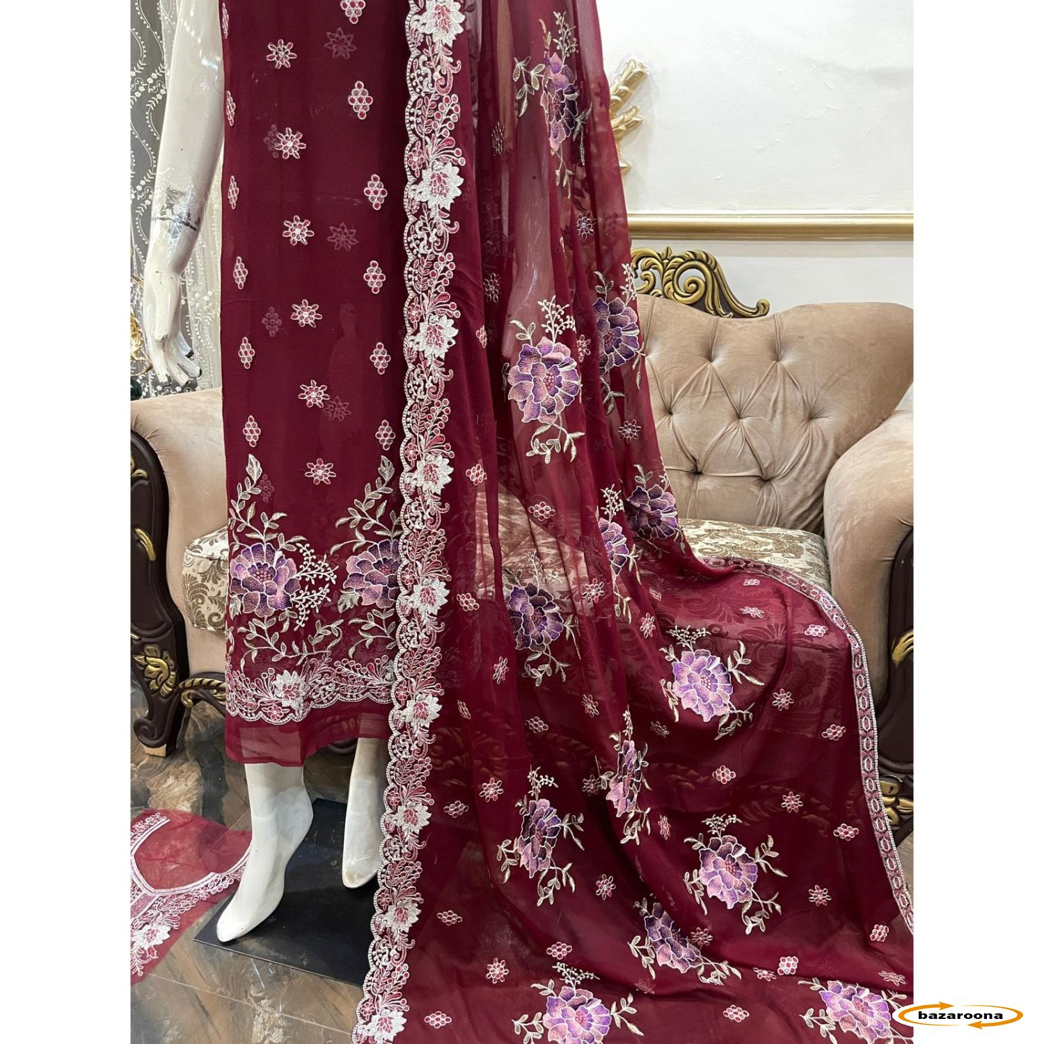 د خالص شیفون ښکلی ګلدوزۍ جامې د ښکلي بشپړ ګنډل شوي شال سره د سرحد سره او د جامو غوره انتخاب ستاسو