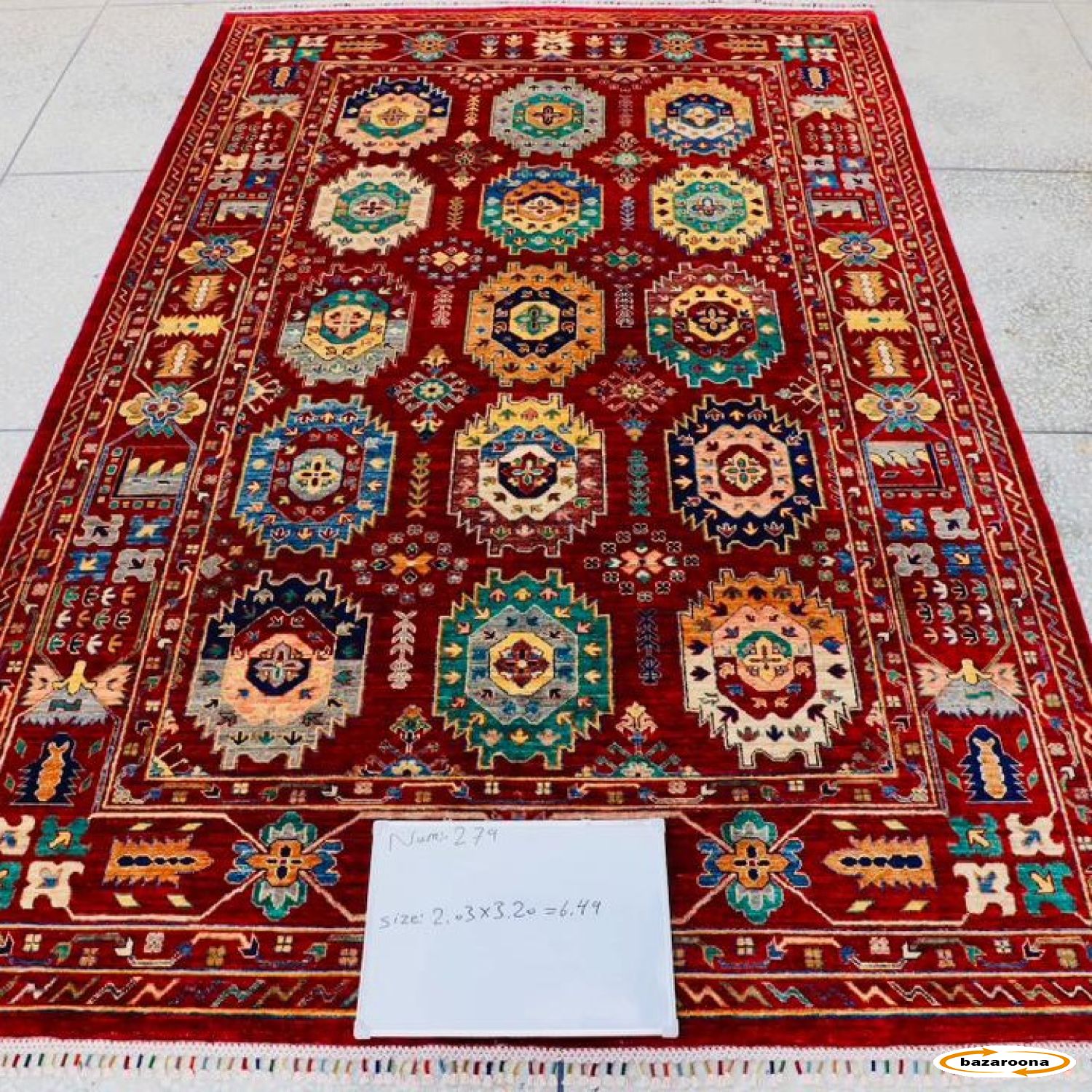 This carpet is designed with a dark red background and diverse geometric patterns in bright and attractive colors. The central patterns of the carpet include floral motifs and geometric shapes that are symmetrically and repetitively distributed throughout the carpet. The borders of the carpet also feature various intricate designs, adding more beauty and richness to the carpet. This carpet can be used as an artistic and decorative piece in the interior space of a home or office, adding warmth and more charm to the environment.