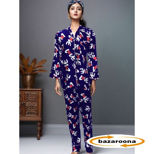 Women's sleepwear in purple, dark blue, black, and pink colors with designs of English alphabet letters.