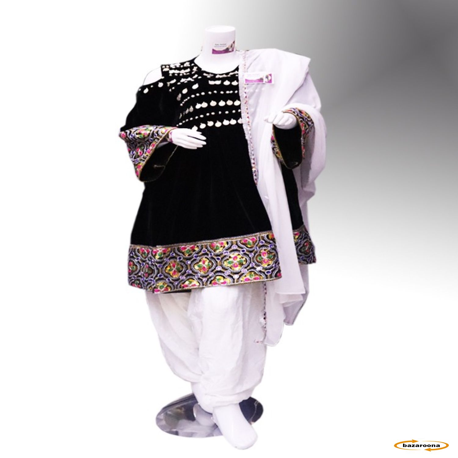 The Afghan Stylish Dress is a beautiful dress with an embroidered floral design over the skirt & sleeves margins and mirrors in the collar side.