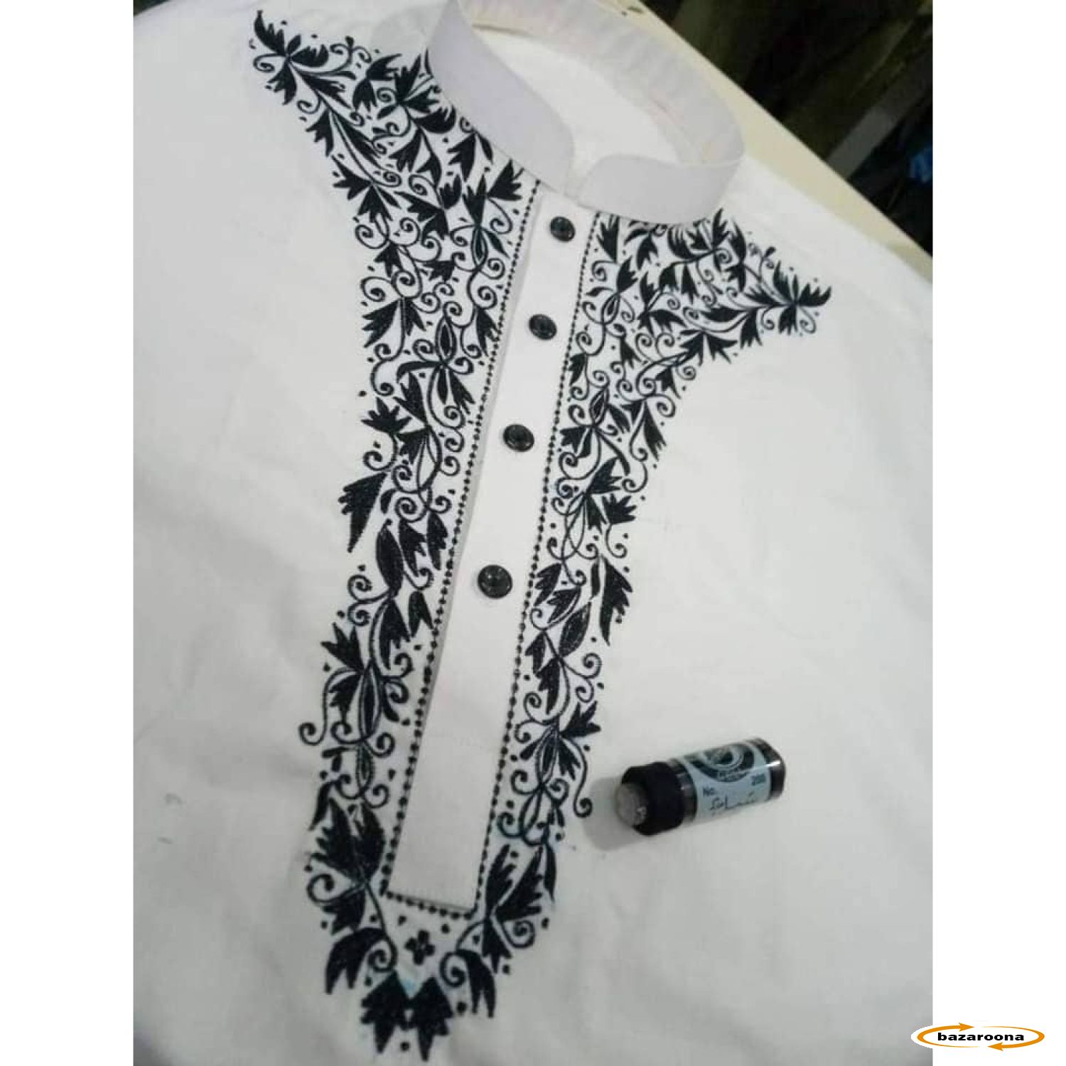 Description:This is a men's traditional shirt featuring intricate black embroidery on the front. The embroidery design extends from the collar down to the chest area, forming a symmetrical pattern with floral and vine motifs. The shirt is primarily white, creating a striking contrast with the black embroidery.