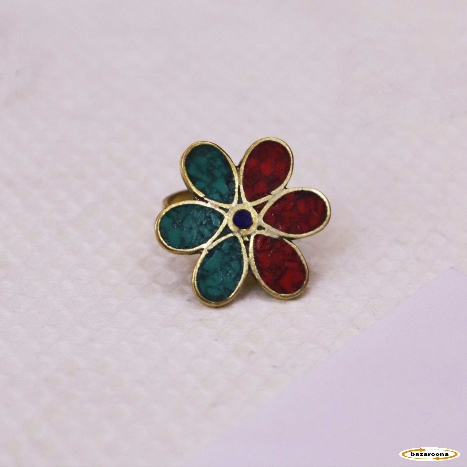 Floral Lapis Lazuli Coral Ring is a beautiful ring with three different gemstones and colors. It has a coral lapis lazuli gem and floral other gems.
