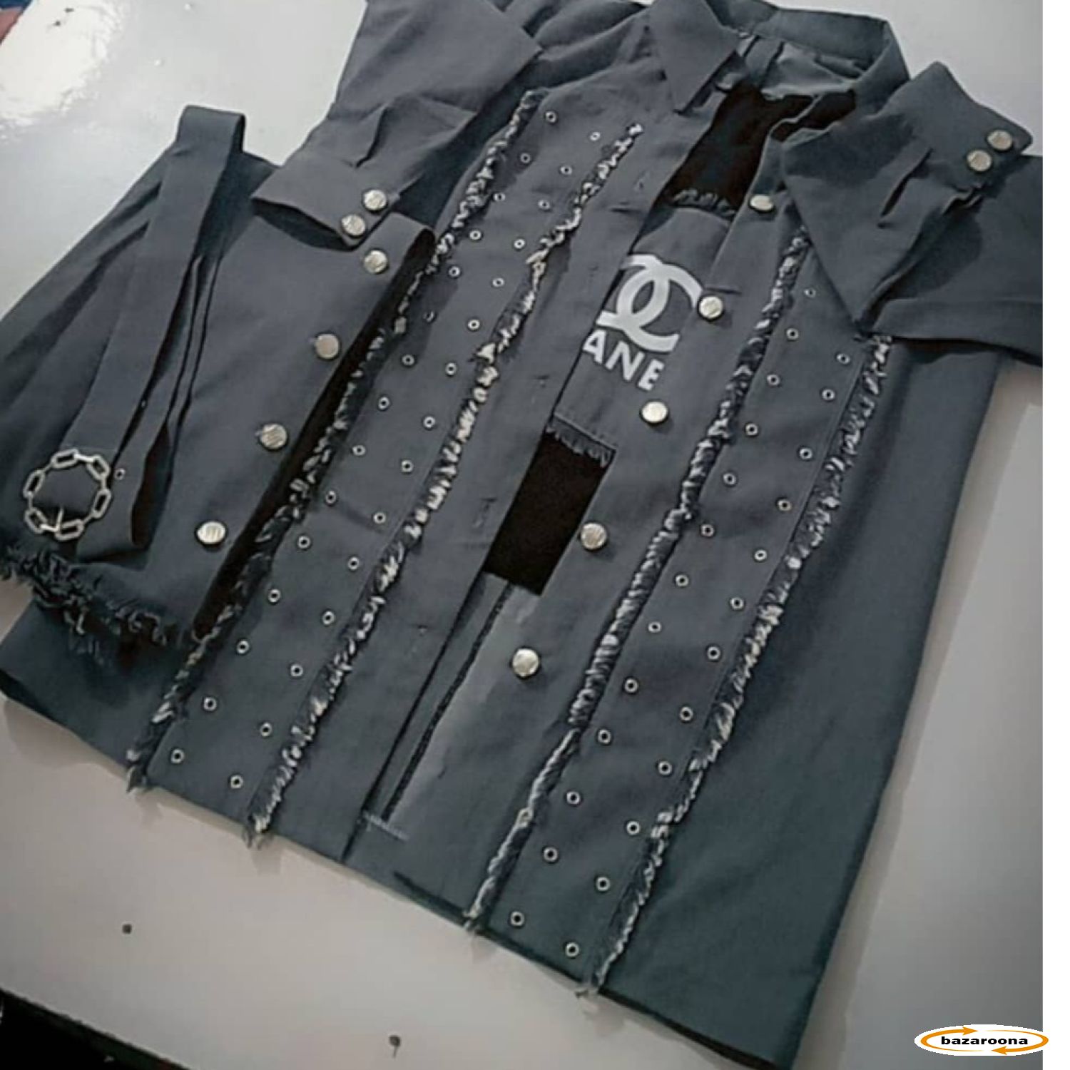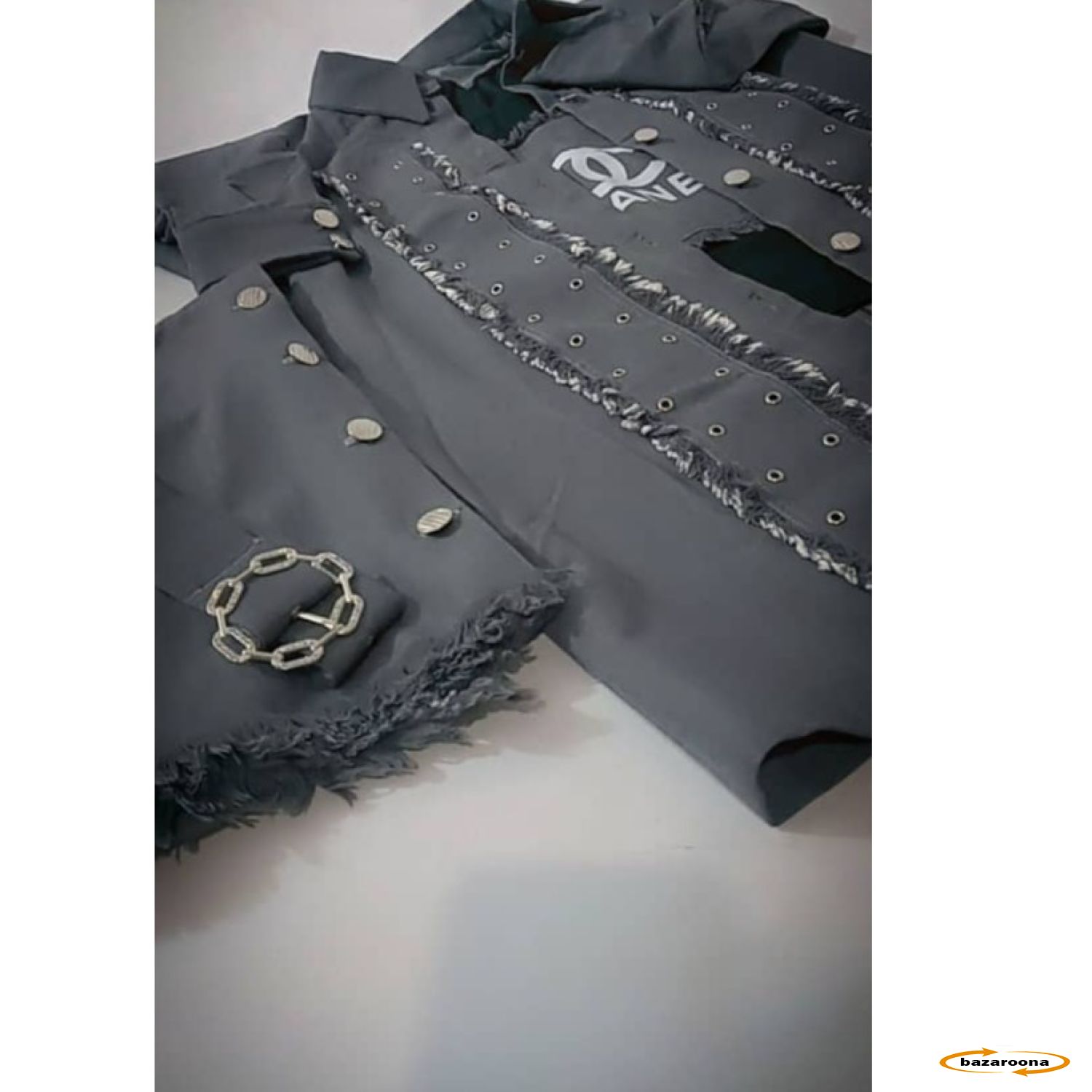 Description:This stylish women's outfit from Kakh Shik Poshan features a unique and trendy design. The outfit includes a jacket with decorative metallic buttons and eyelet embellishments, along with matching trousers. The jacket is adorned with fringe details and has a classic collar, creating a fashionable and modern look. The ensemble is ideal for casual outings and stylish events.