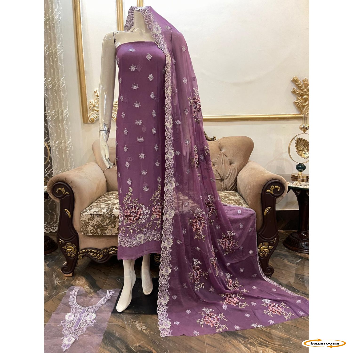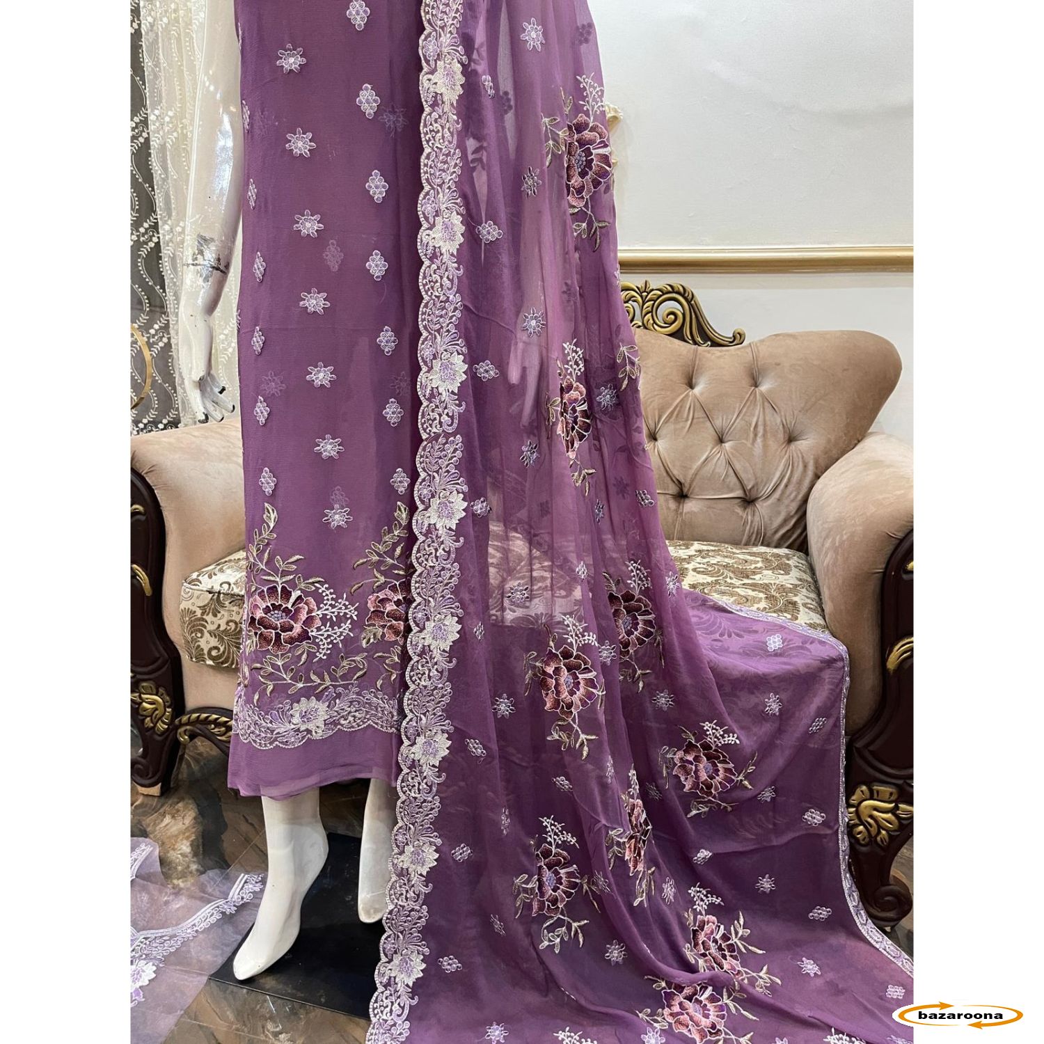 New Pure Chiffon Beautiful Flowers Border Embroidered Outfit Along With Beautiful Fully Embroidered Shawl With Borders And Optional Embroidered fabric