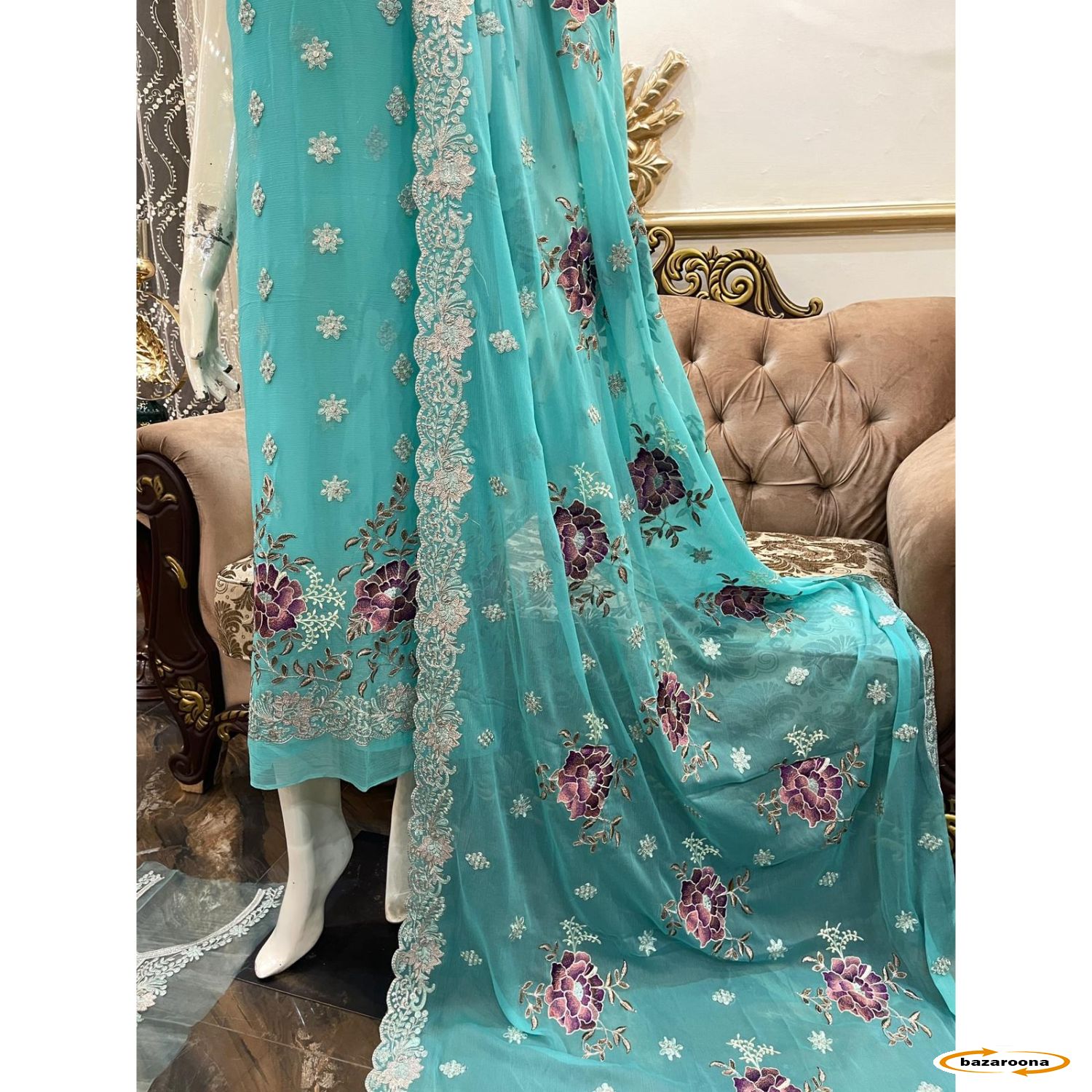 New arrival, Beautiful dresses for your special and normal occasions. New Pure Chiffon Beautiful Flowers Border Embroidered Outfit Along With Beautiful Fully Embroidered Shawl With Borders And Optional Embroidered fabric is a great fabric for you to make it a beautiful dress.