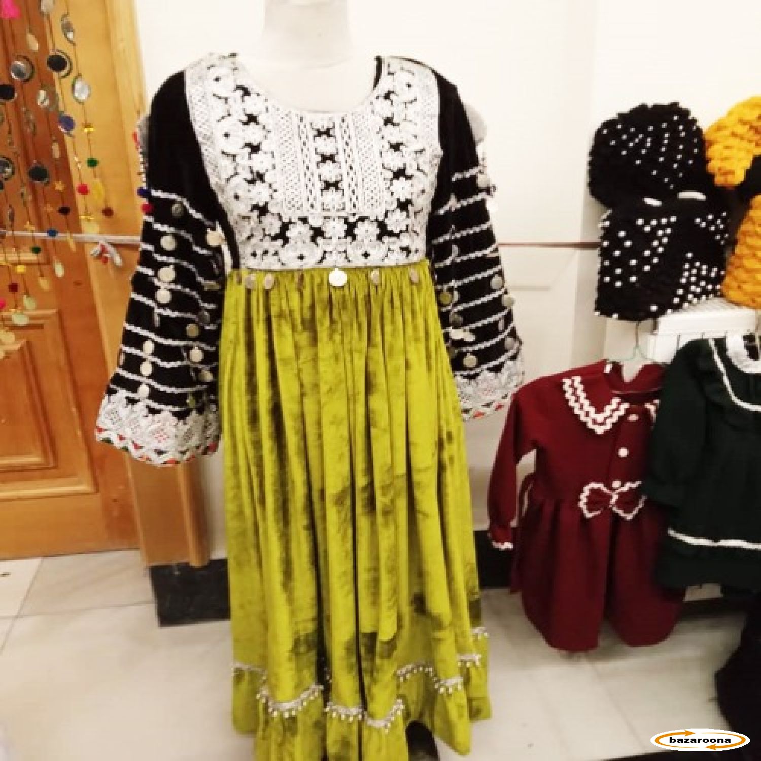 د ښکلو ښځو جامې د مخمل څخه جوړ شوي او د لیس او ګلانو په ښکلي ډیزاینونو سره ډیزاین شوي.