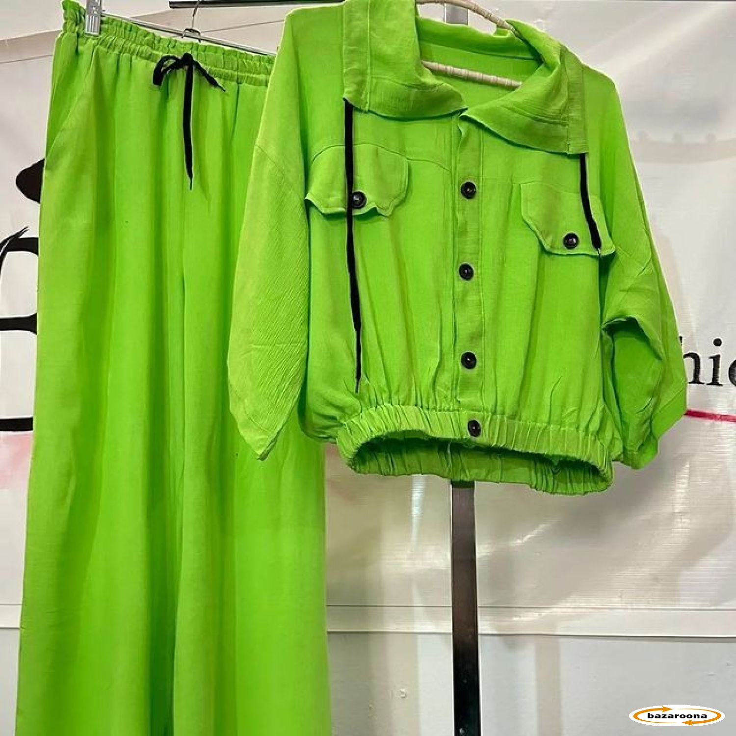 د پنه ټوکر، سپک او د ساه اخیستلو وړ احساس تضمینوي چې دا د ګرمو موسمونو لپاره مناسب ګرځوي. پاسنۍ برخه د کالر لرونکي غاړه، د تڼۍ مخ تړل او دوه مخکني جیبونه لري، چې د شیک او فعال ډیزاین لپاره دي. د لستوڼي او کمر چیندار راحت او ښه فټ چمتو کوي. مطابقت لرونکي پتلونونه د تنظیم وړ آرامۍ لپاره د بند سره چیندار کمر لري. دا سیټ د خپلو خوښې بوټانو سره واغوندئ د یو همغږي او ښکلي لید لپاره.