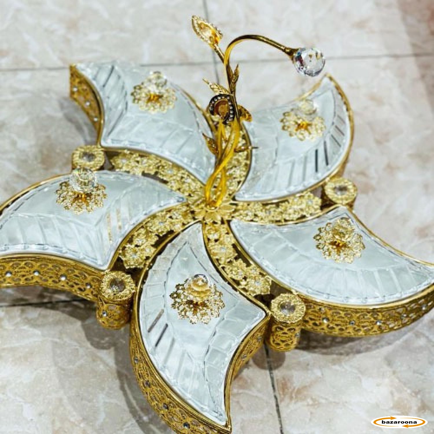 Beautiful home decor dried fruit plate with star shape. This is made of nickel and plastic covers that have beautiful and stylish designs to decorate your home with.