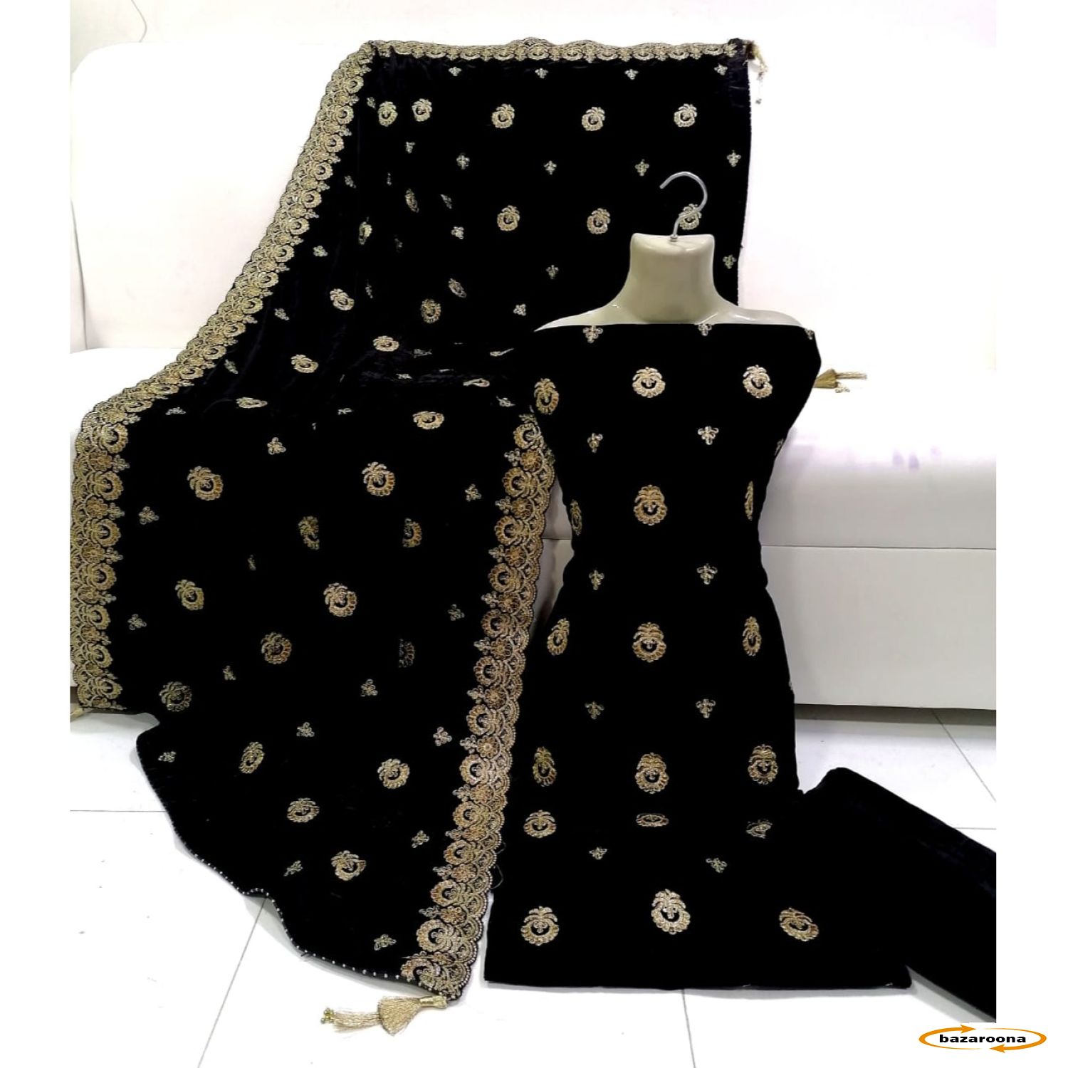 Velvet Fabric with Floral Design All Over Dress with Shawl - 3pcs Fabric